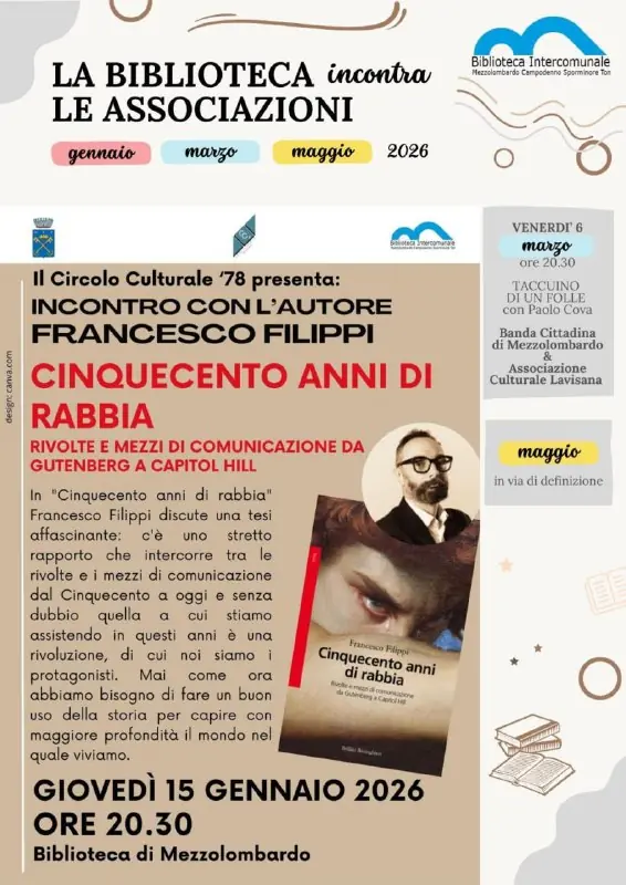 La Biblioteca Incontra le Associazioni - Circolo Culturale '78. Incontro con l'autore Francesco Filippi per Cinquecento anni di rabbia. Appuntamento il 15 gennaio alle ore 20.30.